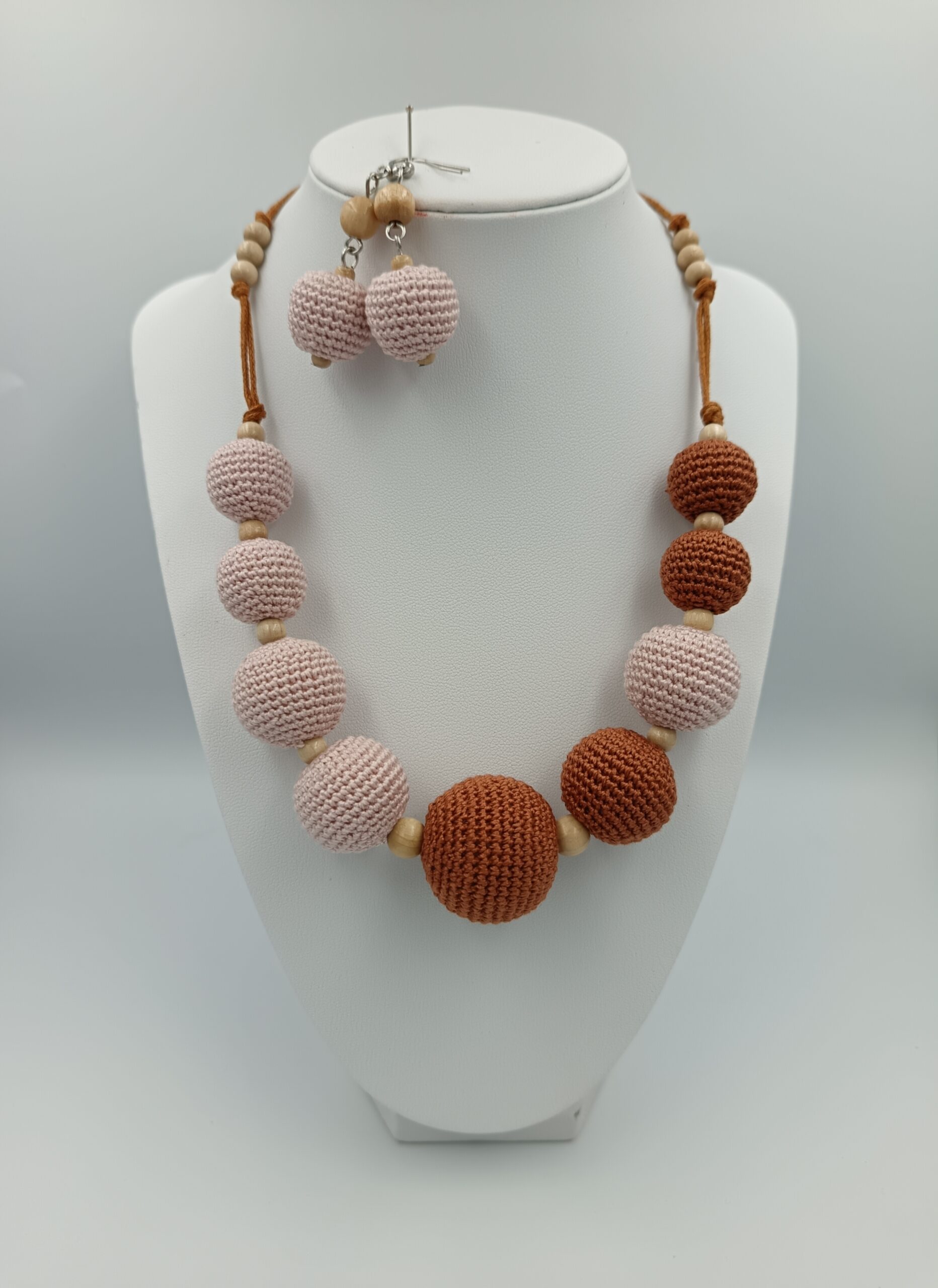 Barna és púder színű, 9 bogyós „Vagány”  szett, natúr fa köztes gyönggyel díszített, viaszolt szálra fűzött. Megkötős fazonban készült, de kérhető kapoccsal, lánchosszabbítóval is.  A bogyó átmérője a láncban 2,2 cm, a fülbevalóban 1,8 cm. A fülbevaló hossza 5 cm a nemesacél akasztóval együtt. A lánc 18 gr súlyú. A fonál alapanyaga 100 % pamut.